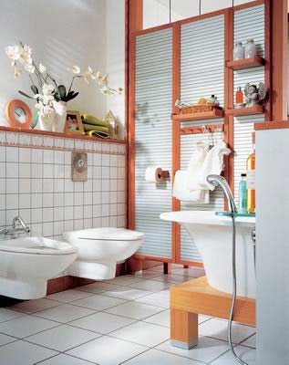 無(wú)論是在臺(tái)盆表面還是在浴室柜的臺(tái)面上,放過(guò)多的清潔衛(wèi)生用品都會(huì)顯得雜亂無(wú)章,而且容易碰倒,因此不妨在面盆上部貼墻的位置釘上10厘米寬的擱板,只要能放得下化妝瓶、刷子、洗漱杯等便可以了。擱板高度以不妨礙使用水龍頭為宜,材料可選用木板、玻璃等。