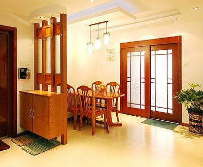 玄關(guān)的間格應(yīng)以通透為主,因此通透的磨砂玻璃較厚重的木板為佳,即使必須采用木板,也應(yīng)該采用色調(diào)較明亮而非花哨的木板、色調(diào)太深便易有笨拙之感。
