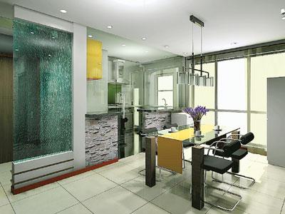 餐廳除餐桌、餐椅外,還應(yīng)配以餐飲柜,用以存放部分餐具、用品、酒、飲料、餐巾紙等就餐輔助用品。在設(shè)計(jì)餐廳時(shí),應(yīng)充分利用分隔柜、角柜,將上述功能設(shè)施容納進(jìn)就餐空間。餐桌大多選用玻璃臺(tái)面,主要是易于打理。餐桌四角的棱角一定要打掉,設(shè)計(jì)成弧形,增加安全性。