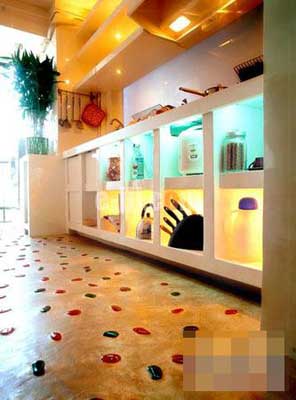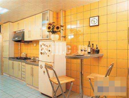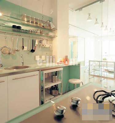 原本極為普通的水泥地面,因?yàn)榍渡狭擞昊ㄊ悴噬袡C(jī)玻璃塊,立即變得活靈活現(xiàn),讓人見之不禁想擺脫鞋襪的束縛,光著腳丫在上面重溫一下海邊嬉戲的快樂。重新筑建的取代整體櫥柜地位的水泥墻體也毫不遜色,開放式的格局設(shè)計(jì),冷熱光源的區(qū)分,讓存儲(chǔ)柜亦是展示柜,廚房小家電及器具既得到了安身立命之所,又成為狹小空間的裝飾點(diǎn)綴。與其它風(fēng)格相比,“一”字型和“L”型簡約風(fēng)格的整體櫥柜更加適合這種封閉式的廚房空間。以直線條為主的整體櫥柜,因磨砂玻璃的加盟,有效地實(shí)現(xiàn)了期盼已久的瘦身,從視覺上為廚房減少了一些擁擠感,并為不甘寂寞的早餐桌騰出一席之地;絢麗的櫥柜飾面,不但可以激起人的食欲,在縱橫馳騁于白色瓷磚間的同色調(diào)的勾線和窗簾的配合下,徹底消除了沉悶的封閉氣氛。
