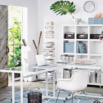 無(wú)論書桌與電腦臺(tái)是否連接,“L”形的臺(tái)面是最適合工作與上網(wǎng)的工作臺(tái)首選方案。臺(tái)面下一定要有一個(gè)足夠大的鍵盤架,最好能放得下鼠標(biāo),為了能讓雙足有充分的伸展空間,臺(tái)面下能空則空,最多加一個(gè)小推柜即可。如果有空間,在電腦臺(tái)旁擺放一個(gè)半高的小文件柜或書架,或是在工作臺(tái)的墻面上搭幾塊隔板,就會(huì)讓文件、書籍、光盤的拿取變得輕而易舉。