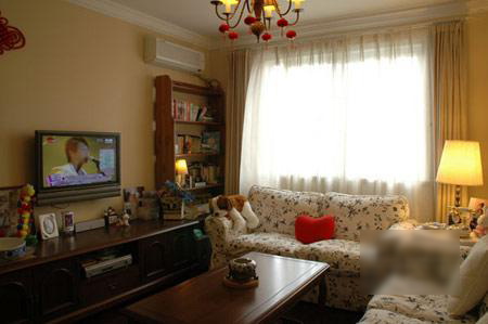 客廳的墻面是麻黃色細(xì)紋壁紙,搭配了白色的頂面和頂角線,顯得溫馨而素雅;墻上新婚的結(jié)婚照是房間最矚目的亮點(diǎn)。
