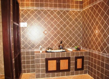 最好鋪貼啞光瓷磚,啞光瓷磚會使人感覺不好清洗,其實這是錯誤的,品質好的啞光瓷磚不但非常容易清洗,而且其細膩、樸實的光澤更能顯示出主人高雅的審美觀,令廚房間的品位更加和諧、自然。