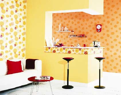 餐廳可以選擇浪漫田園風(fēng)格的墻紙,像清新亮麗的中花圖案、溫馨的小碎花圖案都適用于面積不大的餐廳。此外,橙黃色調(diào)的墻紙,還可增進食欲。