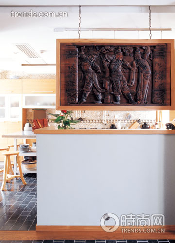 懸吊在廚房開放式窗口重鑲了邊框的“劉、關(guān)、張”木雕,是客人入門后的第一個驚喜看點。