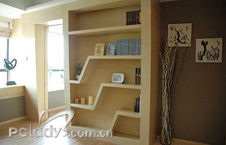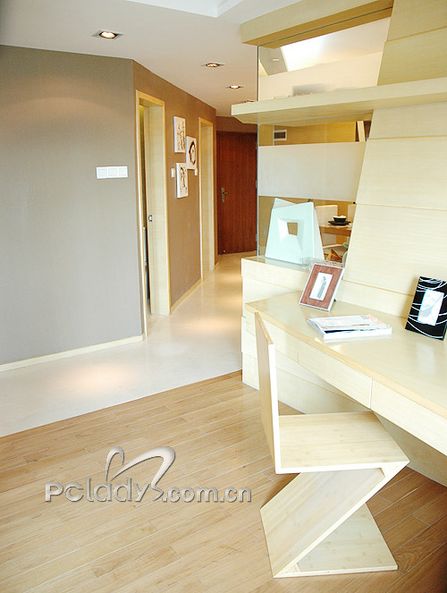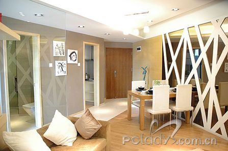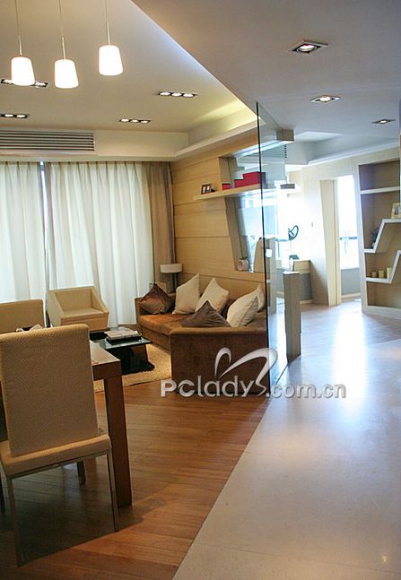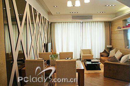 編輯點(diǎn)評(píng):由于這個(gè)戶型的整體形狀不規(guī)則,設(shè)計(jì)師為了很好地利用空間,使布局更適合用家,將格局進(jìn)行了調(diào)整。以通道貫穿了各個(gè)不同空間,同時(shí)起到了劃分空間的作用。經(jīng)過調(diào)整,客廳與敞開式的書房構(gòu)成三角形,客廳雖然面積不大,但光線非常充足,還需要用大大的簾子來稍作阻隔。設(shè)計(jì)師在這個(gè)空間里,充分利用不同材質(zhì)作間隔,劃分空間,又利用很多玻璃、鏡面拓寬空間。間隔客廳和書房的墻體,被巧妙地做成裝飾隔板,上面可以放些主人家喜歡的家居精品,烘托二人的精致世界。客廳里采用的大多是色調(diào)較淺且線條簡(jiǎn)約的家具,打消了空間的沉悶與局限。