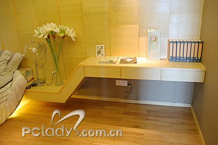 床頭透明的臺(tái)燈為這個(gè)扁長(zhǎng)的空間做了小彌補(bǔ),圓形物體的中和,效果很好