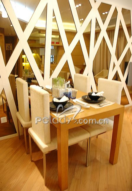 編輯點(diǎn)評(píng):這套樣板間倒沒有開辟出專門的就餐區(qū)域,不過這絲毫不影響設(shè)計(jì)師讓餐廳自成一格的想法??蛷d的鏡子墻邊靠著四人座的餐桌,土黃的桌身配著白色的布藝餐椅,桌上精致的餐具很是吸引人。餐桌上還懸著一盞造型別致的吊燈,讓就餐的氛圍顯得其樂融融。