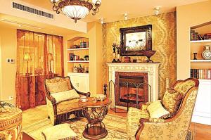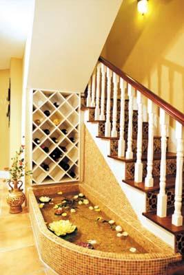 敲開(kāi)門(mén)的瞬間,我們誤以為時(shí)空交錯(cuò),闖進(jìn)了哪位歐洲貴族家庭。厚重的實(shí)木手工沙發(fā)有著絲絨的質(zhì)感以及流暢的歐式卷草紋,精美的仿真電壁爐與一幅古樸的油畫(huà)相呼應(yīng),木制畫(huà)框上仿佛還積著一些塵埃和斑駁的金漆。一樓被劃分為會(huì)客區(qū)、視聽(tīng)區(qū)和餐廳,客廳餐廳之間過(guò)渡了一池美麗的睡蓮。