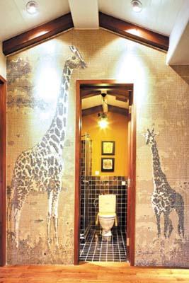 上到三樓,我們的視覺(jué)再次受到?jīng)_擊,恍惚以為剛跨越歐亞大陸來(lái)到東南亞。通往露臺(tái)的一排移門(mén)被設(shè)計(jì)師改造成一個(gè)1米多寬的浪漫飄窗,全部用馬賽克砌成,可以躺下一個(gè)成年人。飄窗前的休閑區(qū)和兩間客房是清一色東南亞草編家具。浴室外墻最高處近4米,設(shè)計(jì)師用最細(xì)小的馬賽克鑲拼了一對(duì)長(zhǎng)頸鹿,一高一矮和天花板的斜坡正好相映成趣。