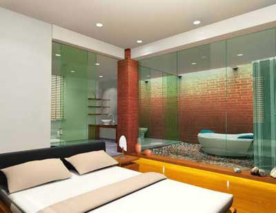 臥室浴室共處一室,中間室一層“綠色”透明的玻璃,可以充分去想象你的“美好”空間了!