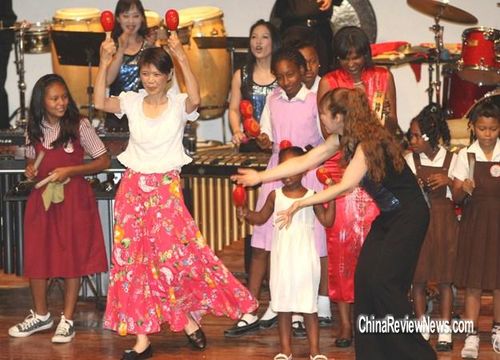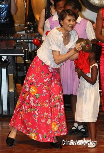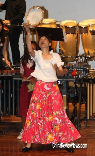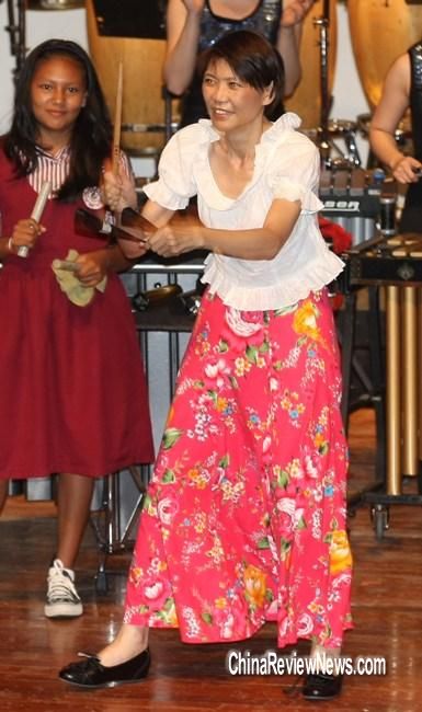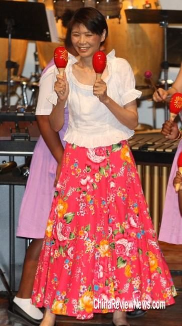 周美青28日(當?shù)貢r間)觀賞打擊樂團表演時,上臺同樂,一連玩了4種樂器,并配合節(jié)奏韻律搖擺,熱力四射。