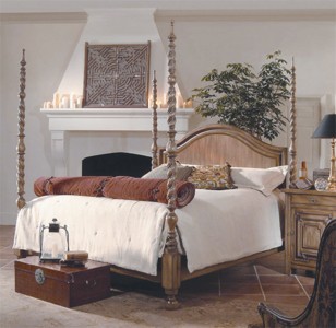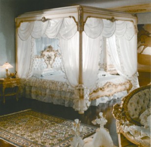 巴洛克式的臥房延續(xù)著法國(guó)宮廷式的美麗,紗簾掛床,絲質(zhì)掛墻,在“King Size”的睡床及貴妃椅周圍鋪以手工精美的地毯,顯示出極度豐華的奢華。巴洛克風(fēng)格的睡床最大特色是將富于表現(xiàn)力的裝飾細(xì)部相對(duì)集中,簡(jiǎn)化不必要的部分而強(qiáng)調(diào)整體結(jié)構(gòu),就某一部分充分夸張。例如充分夸張床頭背板,以局部的花紋鏤空及各種裝飾元素做出強(qiáng)烈的舞臺(tái)效果;或是將回旋的螺紋縈繞在睡床直立的四柱上,平添一份華麗的味道。