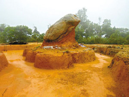 廣州帽峰山有個(gè)傳說:帽峰古廟的香火之所以長盛不衰,是因?yàn)閺R后面有一只招財(cái)蟾蜍。去年年底,帽峰山森林公園管理處打算把帽峰古廟后面的山頂開發(fā)成古廟廣場,當(dāng)把大量黃泥土挖掘掉的時(shí)候,一塊大石頭突然出現(xiàn)。完全挖掘后,一塊形似旺財(cái)蟾蜍的天然奇石展現(xiàn)在世人面前,似乎正應(yīng)驗(yàn)了上述的古老神秘的傳說。