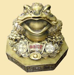 金蟾并非普通蟾蜍,它是擁有三只腳,與其它四條腳的蟾蜍不同,它背北斗七星,嘴銜兩串銅錢,頭頂太極兩儀,腳踏元寶山及寫有“招財(cái)進(jìn)寶、一本萬利、二人同心、三元及第、四季平安、五谷豐登、六合同春、七子團(tuán)圓、八仙上壽、九世同居、十全富貴、乾隆通寶、宣統(tǒng)通寶”等等的銅錢,它只會吐錢。