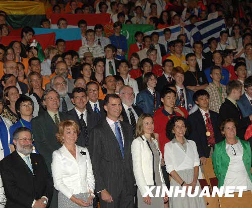 資料圖片:2008年7月21日,西班牙王儲(chǔ)費(fèi)利佩(前左三)和王妃萊蒂西亞(前左四)等與參加國(guó)際數(shù)學(xué)奧林匹克競(jìng)賽的選手合影。