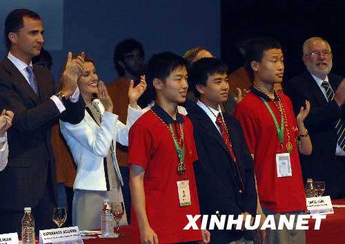 資料圖片:2008年7月21日,西班牙王儲(chǔ)費(fèi)利佩(后左一)和王妃萊蒂西亞(后左二)等為國(guó)際數(shù)學(xué)奧林匹克競(jìng)賽三位滿(mǎn)分獲得者鼓掌,中國(guó)隊(duì)選手牟曉生(前左一)、韋東奕(前左三)及美國(guó)選手阿歷克斯·翟(前左二)是本次比賽的三位滿(mǎn)分獲得者。