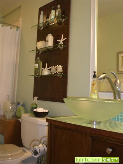 抽水馬桶的沖水槽上方是用廁時達不到的地方,我們可以利用此空間做一吊柜,深度約15厘米左右,才不致給人造成不便。柜內(nèi)可放置衛(wèi)生紙、手巾、洗潔劑、女性衛(wèi)生用品等,也可在下部做成開放式,放些綠色植物裝飾。