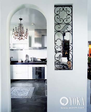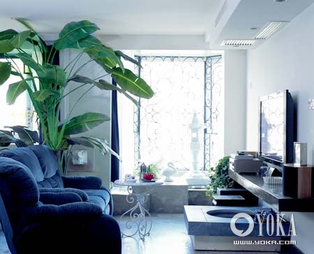 這是屬于單身貴族的居所。一進(jìn)屋,黑、白、灰的色調(diào)過濾了華麗和做作,漢白玉、青白石、水磨石混合著水泥、鐵藝的氣息撲面而來,硬朗質(zhì)感中透出一份特有的酷勁。一張深藍(lán)色沙發(fā)和一棵高大的綠色植物把整個(gè)客廳區(qū)隔成兩個(gè)不同的空間,一邊可以看電視、聽音樂,一邊可以看書、寫字。盡管桌上擺放著一堆書籍和雜志,旁邊立著個(gè)大書柜,但主人并不是簡(jiǎn)單地把書房轉(zhuǎn)移到了客廳,臨著窗戶他還特別打造了一個(gè)可以煮咖啡、泡茶水的小平臺(tái),而立線彩繪的玻璃窗格和簡(jiǎn)約精致的鐵藝座椅,更是給這小小的空間增添了些許閑適氛圍和藝術(shù)氣息。