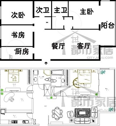 對此,設計師做了如下的調整:首先設計師把廚房的一角墻面向書房推入,從而開辟出放冰箱的空間來;主衛(wèi)的外間被作為儲物區(qū);主臥中多余而浪費空間的墻面也被拆除掉。最終的平面布置如圖所示。