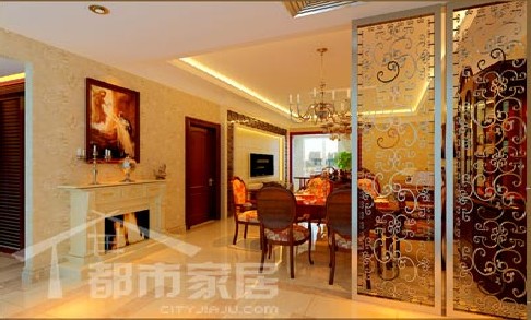 入門處:沒有玄關,設計師在正門對面的墻面做了一個假壁爐,并掛以巨幅油畫,作為入門的第一景觀,從而很好地填補了一入門的視覺空白感。