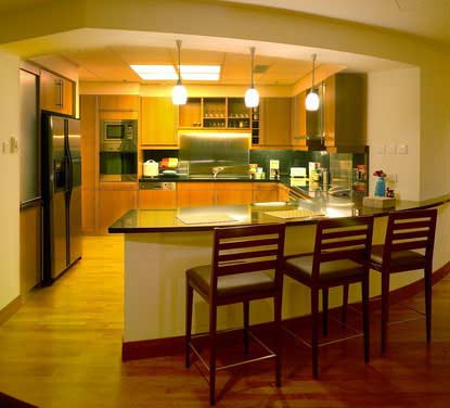 廚房中總是有些小角落。稍大的小角落,主婦們會(huì)擺一張小桌子,或幾把便于就餐時(shí)用的椅子,設(shè)計(jì)師建議選用折疊或長度可調(diào)節(jié)的連柜餐桌,不用時(shí)將其折疊,而可疊加的椅子,則可存放于柜內(nèi)或桌底;稍小的角落安置推拉式高柜,這種儲(chǔ)藏能力很強(qiáng)的柜體大大減少了對(duì)空間的需求。