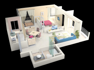 小戶型的居室,對于性質(zhì)類似的活動空間可進行統(tǒng)一布置,對性質(zhì)不同或相反的活動空間進行分離。如會客區(qū)、用餐區(qū)等都是人比較多、熱鬧的活動區(qū),可以布置在同一空間,如客廳內(nèi);而睡眠、學習則需相對安靜,可以納入同一空間。因此會客、進餐與睡眠、學習就應(yīng)該在空間上有硬性或軟性的分隔。