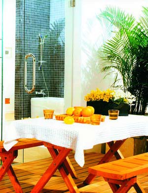 這個空間關鍵的地方不在裝修,而是浴室本身是否具備這樣條件的空間:它必須是朝南的,而且前面比較空曠,保證一年四季有大量陽光可以進入室內。