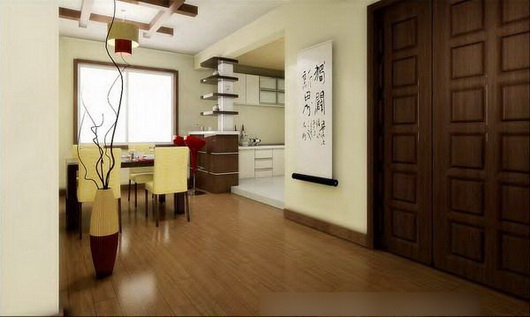 客廳的處理采用了大氣的回廊型吊頂,電視墻采用中式古典的立柱,以及具有中國傳統(tǒng)文化氣息的“印章”(壁紙)處理方式,再加上中式吊頂和胡桃木色的地板,簡約中略帶中國風(fēng);整個客廳的亮點是立柱下的魚缸,它擺放的位置正好是整個居室的“財位”,不僅在風(fēng)水設(shè)計中體現(xiàn)中式元素,也給空間增添了生氣。