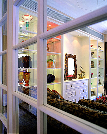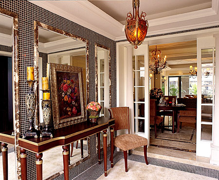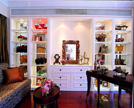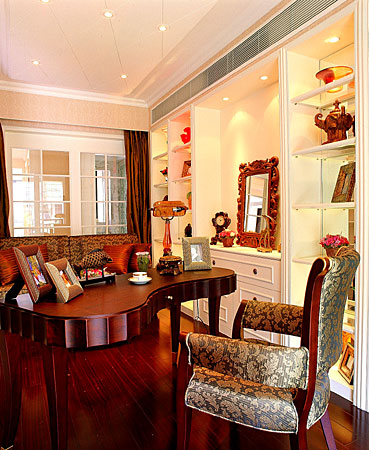 同時通過對稱的手法,將書房設(shè)計成半開放式,在考慮美觀的同時,力求達到合理利用空間的效果。飯廳處特設(shè)歐式壁爐為裝飾,厚實沙發(fā)與包布、茶幾的搭配,均體現(xiàn)出古典、豪華的生活氛圍。同時,設(shè)計師也特別注重主人房洗手間的布局與用材搭配,映襯出濃厚的風格定位,室內(nèi)合理利用空間,充分兼顧功能的齊全,營造出一個高質(zhì)量的生活環(huán)境。