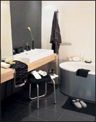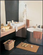 黑色酷而時(shí)髦,是經(jīng)典的風(fēng)格。用黑色給都市男人定性是約定俗成的。所以為他們打造的浴室也自然是黑色的。從洗漱套件到地毯、熏香燈都一絲不差地選用黑色,連男士專用的香水沐浴露都是用黑色來(lái)包裝的。如果覺(jué)得色彩太單一的話,可以用白色、灰色來(lái)調(diào)劑一下,就算是一枝簡(jiǎn)單的馬蹄蓮也可以起到特別的效果。