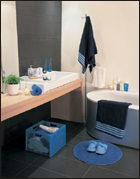 天空、海洋的蔚藍(lán)色可以讓人感到心情舒爽,很適合在炎熱的季節(jié)里表現(xiàn)出來(lái)。藍(lán)色系東西挑選余地很大,因?yàn)橘|(zhì)地的不同而折射出深淺不一的色彩。玻璃、塑料等透明的家居用品最適合設(shè)計(jì)成藍(lán)色,在燈光的照射下十分漂亮。藍(lán)色基調(diào)的浴室能讓你的疲憊在沐浴中流逝,和天一色,和海一色,真是件愜意的事情。