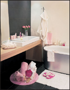 既然黑色給了office里的帥哥,那粉紅就很自然地留給女人。嬌艷的色彩讓人見(jiàn)了就心生愛(ài)意。粉紅蕾絲的紙巾盒、化妝包,綴著花朵的拖鞋把女人的柔媚之情表露無(wú)疑。在這樣的浴室里所有的裝飾品都被染上了這種顏色,玫瑰、香精當(dāng)然是不能少了。這個(gè)城市的性格太冷硬,在浴室里還是讓女人還原一下吧!