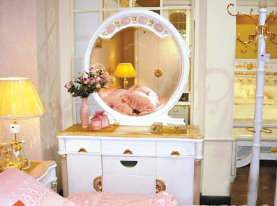 某些梳妝臺(tái)在鏡子部份有兩扇門(mén)作裝飾,在不需要使用鏡子時(shí),可將其關(guān)閉,使用時(shí)才打開(kāi)。而使用這種鏡子,無(wú)論怎樣安放,也不怕沖門(mén)或照在床頭了。