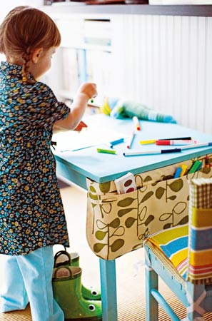 裝園藝工具的帆布袋經(jīng)過(guò)一點(diǎn)微小改動(dòng)后成為孩子們的畫筆收納袋,尼龍搭扣的設(shè)計(jì)讓袋子伏貼于桌子旁邊,從此寶貝兒的畫筆就不會(huì)再到處亂滾了。