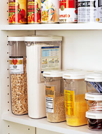 用同樣形狀的容器盛散裝物品會(huì)比較節(jié)省占地空間,如果是食品的儲(chǔ)藏,請(qǐng)?jiān)谌萜魍饷尜N好標(biāo)簽。
