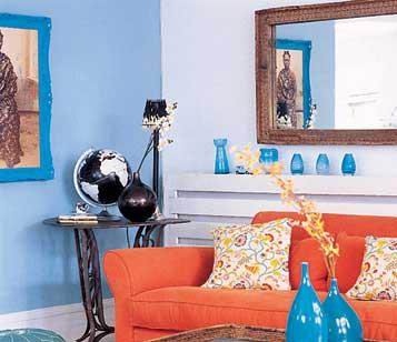 將橙色與綠松石色進(jìn)行大膽的搭配,可以呈現(xiàn)出一種令人震撼的視覺效果。橙色的大沙發(fā)強(qiáng)調(diào)了整個(gè)空間的主體色調(diào),沙發(fā)上圖案簡(jiǎn)單的花卉靠墊與橙色主調(diào)形成一種呼應(yīng)。泛白的綠松石色裝飾墻,延伸出另一種風(fēng)格的空間。薄紗窗簾使室內(nèi)的光線更加自然柔和,帶有戶外咖啡座風(fēng)格的藤條茶幾和扶手椅,讓人很自然地感覺到悠閑與愜意。碰上好的天氣,可以很方便地將他們搬到陽(yáng)臺(tái)上。鐵藝小桌上穩(wěn)固的大號(hào)蠟燭臺(tái)和漂亮的古典式燈籠可以非常方便地為室內(nèi)或室外提供照明。
