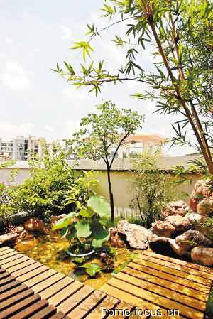 花園是由男主人DIY設(shè)計的!考慮到草地平鋪不好看,將泥土沿周邊堆成緩坡,在自然形成的山谷中間,放了幾塊黃蠟石踏腳,沿著彎曲的小徑,可以觀賞到整個園林中的植物。小山丘上種了一棵姿態(tài)優(yōu)美的珍珠紅楊盆景,小月季從斜置的石頭旁開出小花。此外,還設(shè)計了假山水景。旁邊種上幾棵婀娜多姿的竹子,微風徐徐,沙沙的響聲頓時讓人心曠神怡。