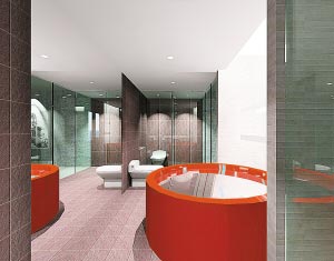 鮮艷奪目的紅色浴缸的大膽利用,讓本來平淡的浴室空間頓時(shí)活躍起來,富有個(gè)性時(shí)尚?! ?/P>