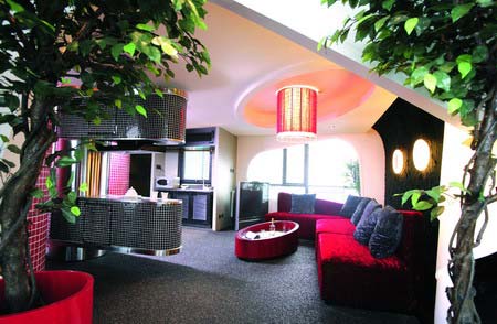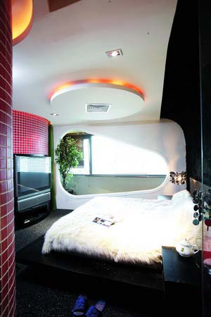 在這個空間里我們很難看得到方正的直線、矩形和直角,取而代之的是無所不在的圓、橢圓、弧線:客廳屋頂?shù)脑煨褪且粋€大大的橢圓,映襯著一盞紅色水紗的吊燈;橢圓吊頂?shù)南路绞切∫惶柕臋E圓——橢圓的不銹鋼茶幾。黑色的主題墻也與眾不同,三面圓圓的小鏡子正輪番映襯著來客的笑臉,而本該開放的陽臺如今卻被不規(guī)則的圓弧遮擋了起來,從鋪滿木板植滿綠植的陽臺看去,圓形邊框中的生活另有一番滋味。