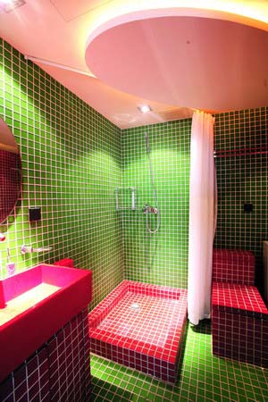 不是沒有見過在家里大面積地使用色彩的人,只是很難像Alex用得這么純粹、這么濃烈。大紅的馬賽克、純黑的地面和墻、綠色的窗簾和洗手間,大面積的色塊形成強烈對比,在短短的方寸之地體驗著強烈的視覺沖擊。