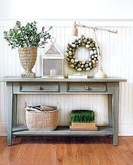 在客廳的玄關處擺放一張淺綠的原木臺,用鵝卵石拼成的花環(huán)帶來了濃濃的田園氣息,與原木家具的本質相當契合,輔以藤制籃子,配上小花小草,清晰的風情立馬鮮活了起來。用原木家具搭配出淳樸的玄關效果相比濃重甚至奢華的更讓人覺得親近、自然。