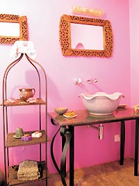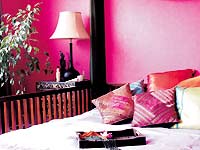 一說(shuō)到泰國(guó),頭腦中就閃出一個(gè)字“艷”。雖然家具是深栗色,但是泰式的裝飾品多是色澤極為艷麗的。金色、翠綠的紗幔,金色珠簾、真絲靠墊、粉紅的荷花蠟燭……有了這些,深色的家具反而更添香艷意味。
