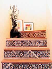 拱形與淡白的色調(diào)是地中海風(fēng)格的突出形象。這個(gè)樓梯是突出地中海風(fēng)格的一個(gè)亮點(diǎn),做法是扶手用磚徹,再用水泥沙漿披一層,最后刷上淡黃色的防水涂料。踏步采用與實(shí)木地板一樣的材料,下面裝飾菱形圖案的瓷磚。