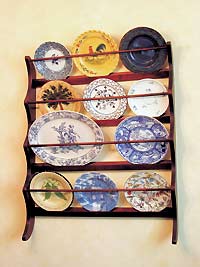 把家中累積的青色細(xì)瓷盤(pán)放在木架上作為墻飾。