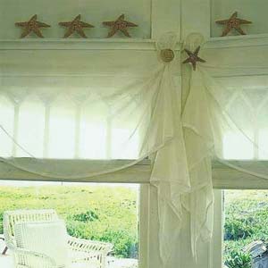 這一種裝飾窗戶的方法特別適合喜歡大海的你。將渡假時購買的海星等貝殼選出完整漂亮的一些,背后用萬能膠將圓頭圖釘粘牢,用它們將白色的窗紗釘在窗戶上方的窗框上,窗框上方再擺放幾支美麗的海星,大海的味道就帶回家了。