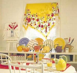 將喜歡的絲巾對角折起來用圖釘掛在窗口,再在下方的矮柜上將自己平時收集的顏色與絲巾相配的美麗餐具擺設(shè)起來,是不是別有情調(diào)?如若搭配上白色的百褶簾,效果更好。