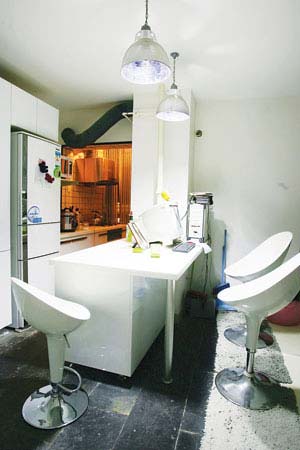 靳喜歡設(shè)計風(fēng)格強烈的空間。受國際前衛(wèi)想法影響,未來感十足的裝飾風(fēng)格被采用。用略帶透明的亞克力材質(zhì)來裝飾天花板和墻壁,里面放置的燈管讓整個空間立刻充滿外太空似的未來氣氛。廢棄的暖氣管子被做成了茶幾,厚重的鋼板被制作成玄關(guān),墻面都露出了粗糙的水泥,讓整個空間充斥著硬朗的感覺。在通過掛著不少干花的紗簾之后,不論是色彩還是燈光,浪漫而曖昧的情調(diào)應(yīng)運而生。于是,在這個空間里,既擁有了硬朗風(fēng)格,又有了浪漫情調(diào)。