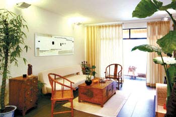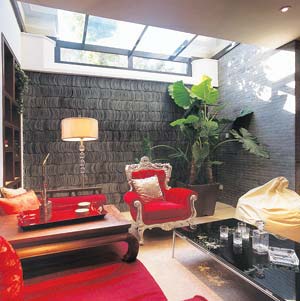 這是一個封閉的陽光房(見D04版圖片),玻璃頂使得房間光線充足,這讓設計師有了很好的發(fā)揮空間。一面墻采用堆砌成的青色瓦片狀的裝飾磚貼在墻面上,另一面墻則做成古典的青磚裝飾,兩面青灰色系的墻壁頓時使這個房間有了濃厚的中式味道。靠墻的深色中式大榻上,有著舒適的大紅色軟墊。上面擺著一張厚重的木制小茶幾,原色的茶幾腿被處理成彎曲的弧形,印著中文繁體字的大紅色絲面靠墊與大紅色的軟墊相互呼應,色彩異常艷麗。