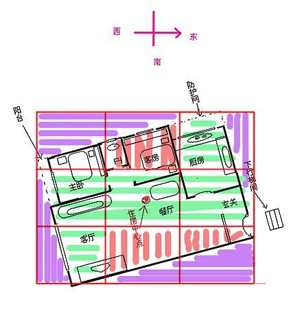 除了缺角,還有一個問題,就是大門的方位。沒有斜度的情況下,大門在東南方,屬于巺門,而存在斜度的時候,則大門在東,為震門。門的方位不同了,房子內(nèi)的吉祥位置就會隨著變動,這是因為吉星位置不是固定的,是隨著門的位置來改變的。在風(fēng)水學(xué)中,就是:“門轉(zhuǎn)星移定乾坤”。